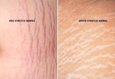Stretch marks, also referred to as striae distensae, are the streaks on the skin formed in the body sites subject to continuous skin stretching. They have different textures and colors as compared to the surrounding rest of the skin. Typically, newly formed stretch marks appear pink, red, or purple colored, which fades over time. As they become mature or old, they appear whitish-grey.